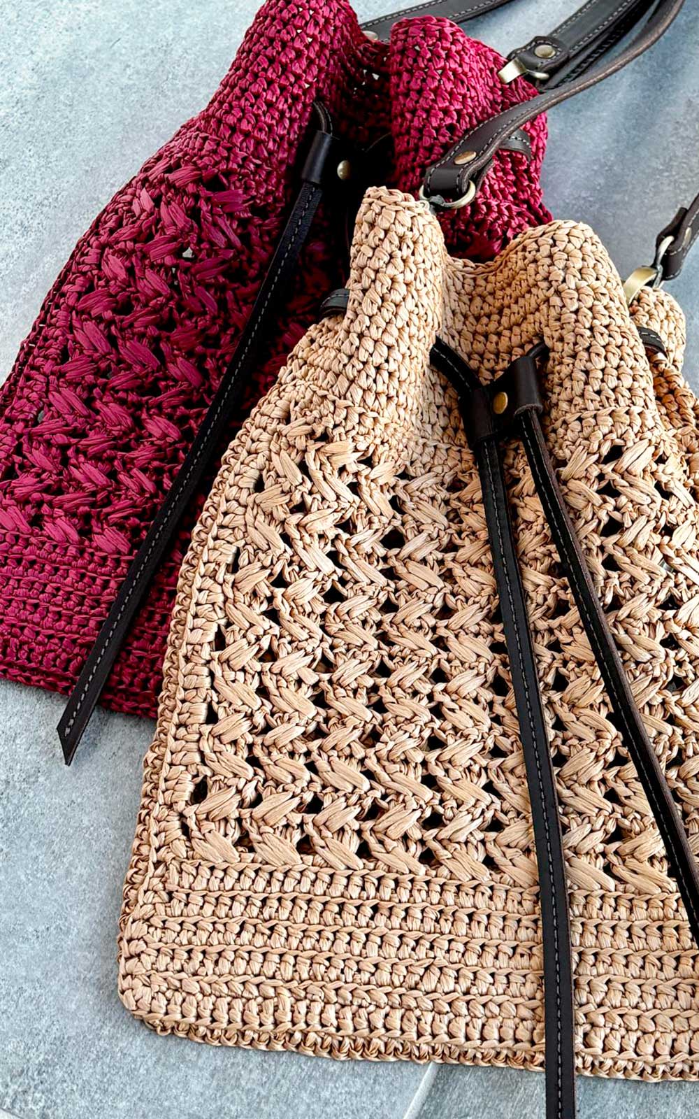 Bolsos de rafia disponibles en varios colores y correa de piel.